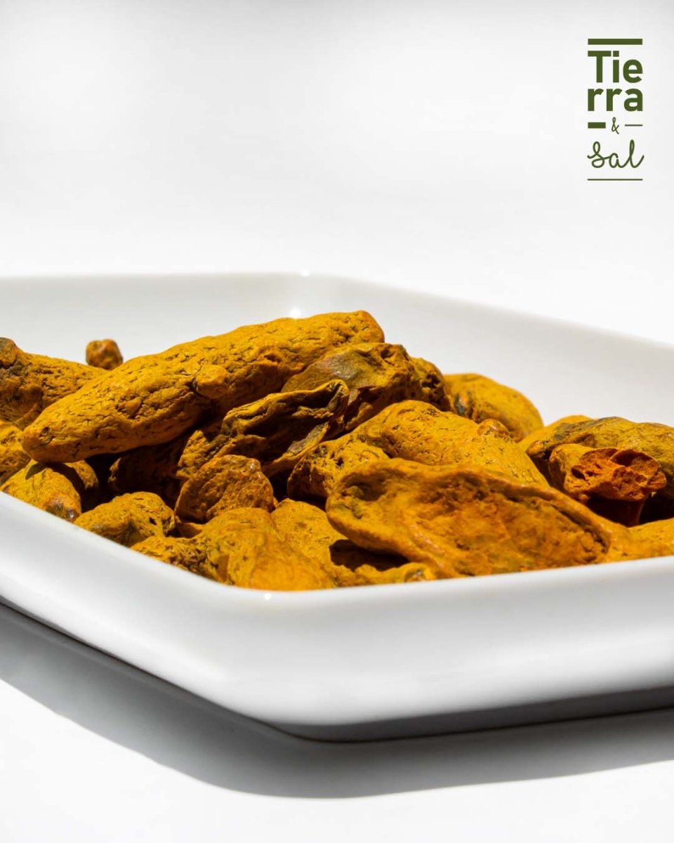 - Raíz de cúrcuma deshidratada, seleccionada y cortada en piezas.